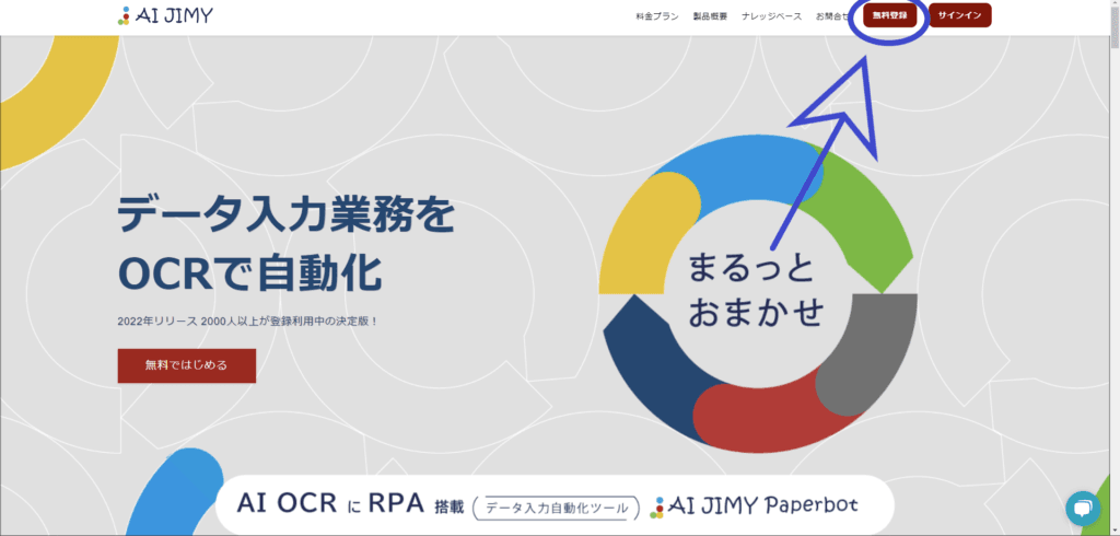 AI JIMY Paperbot公式サイトへアクセスし、右上の無料登録をクリックします